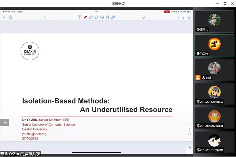 Zhu博士首先介绍了iForest(孤立森林,一种著名的点异常检测方法)及其使用孤立机制对树结构的改进。随后,他介绍了基于孤立的方法在异常检测之外的最新发展,即孤立核函数(Isolation Kernel)和孤立分布核函数(Isolation Distributional Kernel)。孤立核函数具备高效解决数据挖掘和机器学习中一些经典问题的能力。这包括(1)聚类,这是自20世纪50年代首次研究k均值聚类以来,第一个具备真正的线性时间复杂的聚类算法,且没有k均值的聚类约束;(2)时间序列的表示和相似性测量,虽然学术界已经在基于时域和频域的测量进行了一个多世纪的研究,但是IDK为时间序列的处理提供了首次的范式转变。最后,Zhu博士结合IK和IDK在数据可视化和数据流聚类任务中的应用与到会教师学生进行了交流。