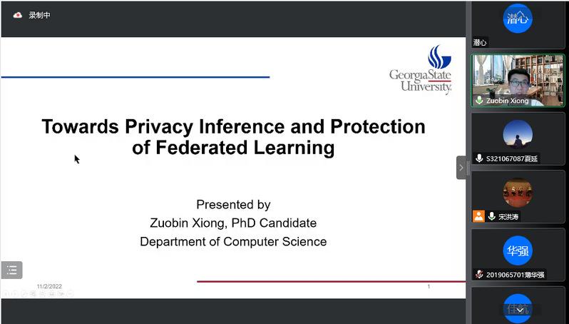 2022年11月3日,计算机科学与技术学院举行了智汇论坛2022年第五期(总第九期)活动。本次活动邀请美国佐治亚州亚特兰大佐治亚州立大学计算机科学系博士候选人熊作彬以“联邦学习中的隐私攻击与隐私保护”为题作专题讲座。