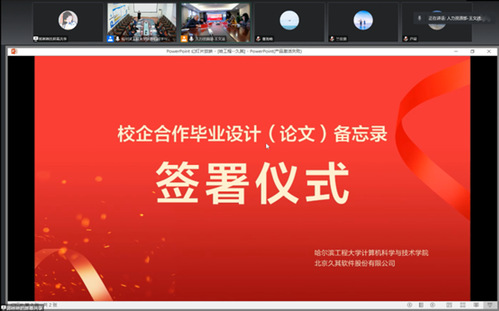 11月7日下午4点,计算机科学与技术学院与北京久其软件股份有限公司开展毕业设计(论文)入企合作交流对接会,参加会议的有北京久其软件股份有限公司副总裁/人力资源总监朱晓钧、企业研发中心总经理王站、政府研发中心总经理王东浩、久其易实教育副总经理董海峰、人力资源部经理张金锴、人力资源部招聘主管杨少华、人力资源部校园招聘主管王文洁、毕业设计企业指导教师,哈尔滨工程大学计算机科学与技术学院院长蔡成涛、党委书记刘冬、副院长董宇欣、副院长田凯、张立国副教授、张越副教授。会议由计算机学院副院长田凯主持。