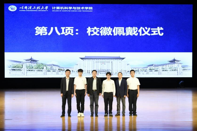 刘劼校友、孙荣平书记、苘大鹏副院长共同为新生代表佩戴学校校徽。一枚枚庄严而神圣的校徽,承载着哈军工人的使命和担当,也标志着2025级新生正式成为“大六系”家庭的一份子,肩负着“强国强军+计算机”的双重使命。