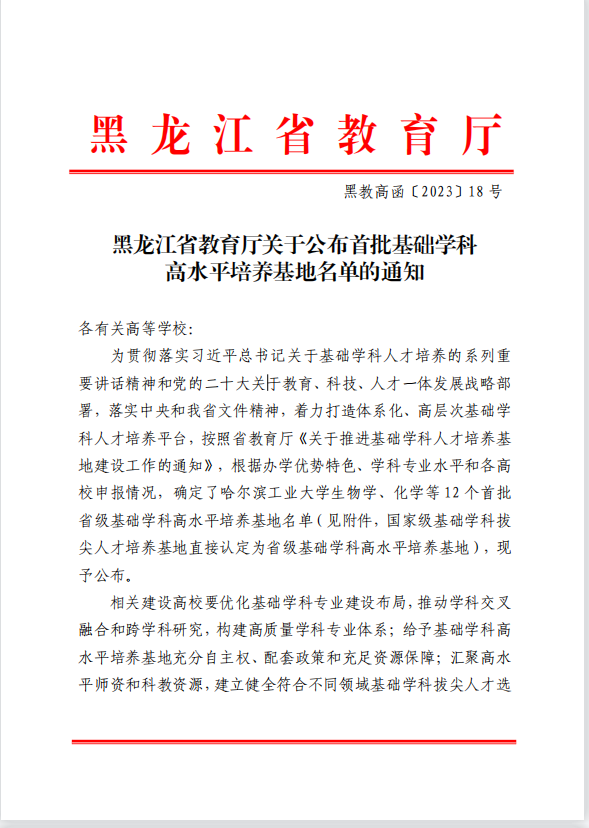 近日,在黑龙江省教育厅发布的《首批基础学科高水平培养基地名单的通知》中有12所高水平培养基地入选,我院“计算机科学高水平培养基地”榜上有名。