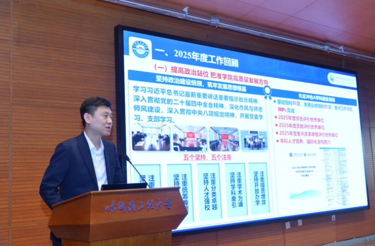 苘大鹏副院长代表学院做2025年度工作总结。报告分别从学院发展、学科建设、人才培养、科学研究、师资队伍、学院服务治理进行工作回顾总结,重点剖析当前学院发展所存在的问题及如何组织和实施2026年各项重点工作。他指出,希望学院每一位教职员工踔厉奋发、勇毅前行,奋力开创学院高质量发展新局面。